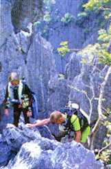 This spectacular dive starts with some challenging mountain climbing in full diving equipment over sharp limestone cliffs. We do wear tennis shoes or sandals and carry our fins strapped to our tank. We use 53 cubic foot tanks for this dive as they are more than 4 kilograms lighter than the usual aluminum 80. The climb only takes 10-15 minutes and the exertion is worth it. The scenery around the lake is spectacular and the under water terrain has been likened to flying over the surface of the moon. The top 4 meters is warm fresh water. Below 4 meters the water is salt. There are dynamic changes of water temperature in the lake with temperatures ranging from 28 to 38 Celsius. You can even see the thermoclines at 4 and 14 meters. At 34 to 35 meters the water changes from crystal clear to tea brown due to the tannic acid in the leaves that fell into the lake. After cooking and boiling, you will meet the "king of the lake." It is a barracuda approximately 1.5m long that likes to guide divers around his domain. It is a good chance for underwater photographers to get a close-up of the big barracuda. A dive that you should not miss! Max depth: 35 meters. Recommended certification level: Open Water Diver, Mountain Climbing Diver Specialty. Cathederal Cave A cave under Coron Island, Palawan directly connected to the sea. Location: South end of Coron Island on the East side. Cathedral Cave is a beautiful dive spot. It starts 6 meters deep at a hole in the bottom of the sea next to the sheer rock wall of Coron Island. You enter a tunnel and descend to 12 meters. If you take the time to look, you see the antenna of juvenile lobsters waving from holes in the tunnel above and out from under the rocks below and cowry shells clinging to the ceiling of the tunnel. Then you pass out of the tunnel and see a shaft of daylight penetrates the interior of a cave. The roof of the cave has collapsed sending down a full sized tree. The skeletal trunk and main branches of the tree rest on top of the sand mound in the middle of the cave. You follow the light and surface inside a big underground cathedral. You pass over the sand dune and continue ahead and left to another passage that leads to a chamber with an air pocket above ocean level. Back through the tunnel into the open sea and you dive among beautiful corals with 20 to 30 meter visibility. A dive you should not miss! Maximum depth: 10 meters inside the cave. Recommended certification level: Advanced Open Water Diver, Cavern Diver Specialty. Weather Advisory: Cathederal Cave MUST ONLY BE ATTEMPTED in calm weather with slight waves. It would be physically dangerous to attempt to enter the tunnel in the surge generated from large waves. The Cave in Barracuda Lake A very deep and serious cave in Barracuda lake entered from Barracuda Lake at 33 meters depth which allows a penetration of 30 meters. Location: North Wall of Barracuda Lake starting at 33 meters deep. The cave has been marked with a fixed line on the right side as you enter. The cave is just large enough to allow one diver to swim in and turn around. The silt and sediment on the bottom is packed and should remain down with reasonable care by the diver. This cave is dark and the sediment is dark and gives an eerie sensation. Proper equipment would be a light with backup and at least an octopus with a 7-foot hose or redundant alternate air source. The current in the cave tells you that it is connecting Barracuda Lake to the ocean. This is a dive that you should not miss if you are prepared. The combination of mild nitrogen narcosis at depth and the dark confined surroundings on this dive will tell you if you are claustrophobic for continued cave diving. Max depth: Please do not descend below 40 meters! Recommended certification level: If you limit your penetration to a maximum of 40 meters total distance from the surface (a 6 meter penetration) then Advanced Open Water Diver with Deep Diver Specialty and Cavern Diver Specialty is sufficient. If you wish to penetrate beyond 40 total meters from the surface then you should be Cave Diver trained and carry the necessary redundant equipment. Nanshin-Maru tanker (Civilian tanker / 834 gt.) The so-called "Black Island Wreck" can be easily identified as a small tanker converted to carry specific fuel (gasoline, Diesel, lube oil etc.) in small isolated tanks for replenishment of land-based depots. The ship is approximately 50 meters long sitting upright on a sandy bottom. Location: Close to Black Island Beach in front of the stranded vessel. This wreck is located 3.5 hours away from Dive Right. It is done as a day trip with a 7 AM departure. We would normally make one dive here and dive the Okikawa Maru as a second dive on the return trip. This dive site is perfect for beginner wreck divers and underwater photographers. It is a beautiful dive in clear water. You can see plenty of scorpion fish, lion fish, trumpet fish, groupers, and bat fish.